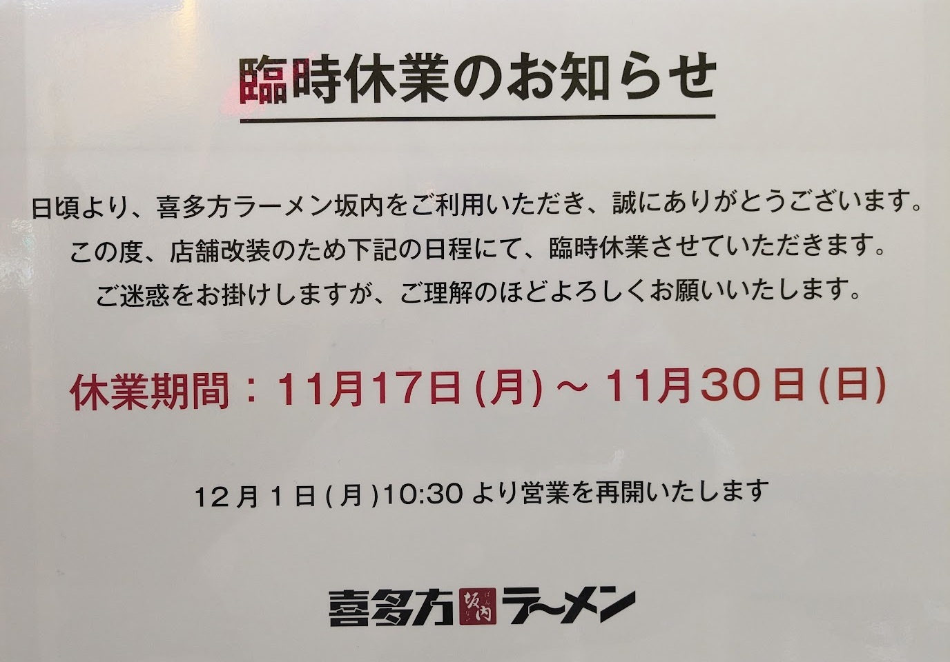 喜多方ラーメン坂内多摩センター店 改装のため休業のお知らせ
